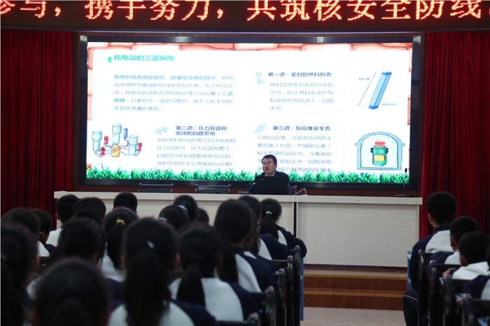 來自華東核與輻射安全監督站監督二處的寧德核電現場監督組長陳威向福鼎十七中師生普及了核電基礎知識,通過生動形象的圖片、視頻及通俗易懂的語言,從"什么是電"的問題切入,深入淺出地向同學們講授核電發電原理、核輻射、核應急及核電安全監管等方面內容。他還介紹了寧德核電廠區優美的環境,普及核電安全、清潔、無污染的特點。在授課期間,陳威結合講解內容,充分調動同學們探索核電知識的興趣,穿插了趣味互動問答環節,同學們熱情高漲,紛紛舉手答題,還表示希望能夠有機會到核電站參觀。現場課堂氛圍高潮迭起,不時傳來同學們熱烈的掌聲。