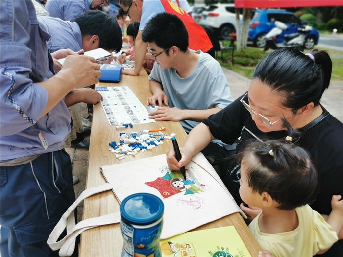 在游戲互動(dòng)環(huán)節(jié),邀請(qǐng)小區(qū)入住的六組家庭一起拼裝核電機(jī)組樂(lè)高模型,互動(dòng)親子的拼裝樂(lè)高模型把活動(dòng)推向了高潮,家長(zhǎng)們帶著孩子們耐心、細(xì)致地拼裝模型,志愿者穿插講解核電站的廠房、發(fā)電流程、安全保障,讓家長(zhǎng)和小朋友在拼裝過(guò)程中加深了對(duì)核電的了解,對(duì)核安全的認(rèn)識(shí)。